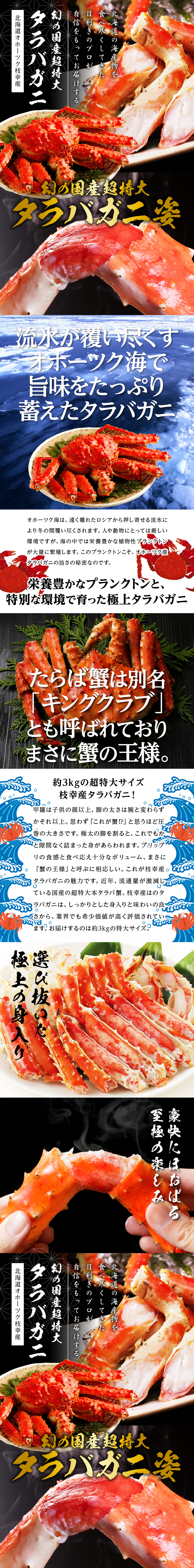 北海道の海産物を食べ尽くしてきた目利きのプロが自信を持ってお届けする「北海道オホーツク海産 タラバ蟹 超特大4.8k前後」。