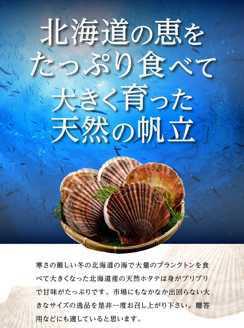 寒さの厳しい冬の北海道の海で大量のプランクトンを食べて育った北海道産の天然ホタテは身がプリプリで甘味がたっぷりです。