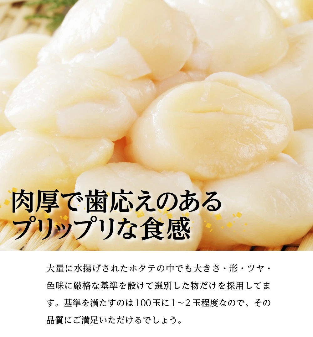 大量に水揚げされたホタテの中でも大きさ・形・ツヤ・色味に厳格な基準を設けて選別した物だけを採用しています。